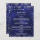 Ein klassisches Hochzeitsmenü. Marineblau, mit Imitaten verziert, silberne Glitzer Glitzern. Die blaue Farbe ist ungleichmäßig. Weißer Text. Personalisieren Sie Ihren Namen, das Datum und das Menü und fügen Sie es hinzu. Sie können mehr Text hinzufügen, Fotos auf der Rückseite. 1 Blatt = 1 Menü, mit dem die Kante an Kante aufgedruckt ist.