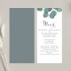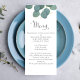 Schönes, üppiges Blattwerk, Eukalyptus-Empfang-Menü-Karte für Hochzeiten, mit Kalligraphie-Skript, einfacher Eukalyptusgrün und grünem Blattwerk, perfekt für die Dekoration der Hochzeitsfeier