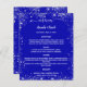 Ein klassisches Hochzeitsmenü. Ein königlich blauer Hintergrund. Weißer Text. Dekoriert mit Imitaten silbernen Glitzer, Glitzern. Personalisieren Sie Ihren Namen, das Datum und das Menü und fügen Sie es hinzu. Sie können mehr Text hinzufügen, Fotos auf der Rückseite. 1 Blatt = 1 Menü, mit dem die Kante an Kante aufgedruckt ist.