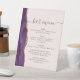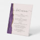 Ein elegantes Zeichen für Ihr Hochzeitsmenü. Die Wörter "Bar menu" erscheinen in der handgeschriebenen Kalligrafie mit Holzschliff am Anfang und Ende, mit unten anpassbarem Text. Ein lila Aquarelldesign mit vergoldetem Imitat-Glitzer schmückt den links Rahmen auf einem rot-rosa Hintergrund. In unserer Kollektion finden Sie die passende Hochzeitseinladung und das Tagesgeschäft.