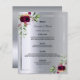 Eine elegante bohemianische Hochzeitskarte. Federn und üppige, wasserfarbene Rose in Bordeaux. Vorlagen für Ihre Namen, Datum und das Hochzeitsmenü. Ein silbernes Imitat und ein elegantes, glamouröses Imitat silber metallisch aussehend. Schwarze Buchstaben. Zurück: Imitate silber metallisch aussehender Hintergrund.