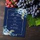 Elegante Rosen und Weiß schmücken dieses wunderschöne Blumenmenü aus dem Abend für eine Winterhochzeit. Der goldgelbe Rahmen aus schicken Imitaten ist mit hübschen indigofarbenen Blume und einem zauberhaften, hellgelben botanischen Kragen besticht. Fügen Sie Ihre Getränkekarte in weißer Schrift für Ihre Gäste hinzu.