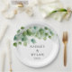 Diese Hochzeitspapierplatte wird mit einem Eukalyptusrebe-Blätter in Kunstdruck dargestellt. Passen Sie dieses Element an, und ändern Sie den Beispieltext in Ihren Text. Suchen Sie nach unseren passenden Papierservietten und Untersetzer. Lizenziertes Bild