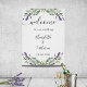 Ein schick weißer Hintergrund. Mit Lavendelblumen, Blume und Eukalyptus-Pflanzen dekoriert. Violett und schwarze Buchstaben. Personalisieren und fügen Sie Ihre Namen und das Hochzeitstermin.