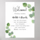 Ein modernes, elegantes Hochzeitsprogramm, Zeitleiste. Weißer Hintergrund, mit Eukalyptusgrün dekoriert, mit Sprigs. Personalisieren und fügen Sie Ihre Namen und Hochzeitsdetails. Schwarze Buchstaben. Wenn Sie mehr Text haben, ist es möglich, den Zeilenabstand zu verringern.