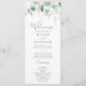 Dieses helle Grün- und Blattprogramm ist perfekt für eine moderne Hochzeit. Das elegante botanische Design besticht durch helle und luftige Eukalyptusfarben in Aquarellfarbe, die mit skurrilen goldenen Glitzer-Blätter besticht. Geben Sie den Namen der Braut und des Bräutigams, das Datum und den Ort der Hochzeit, Dankeschön-Nachricht, Dienstordnung, Brautparty und ein optionales "in Loving Memorial" ein.