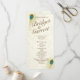 Elegantes, goldenes Pfauenfederdesign bedruckte Hochzeitsprogramme mit braunem Text auf einer Rackkarte.