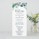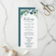 Dieses üppige Grün- und Eukalyptus-Hochzeitsprogramm ist perfekt für eine elegante Hochzeit im Hinterhof. Das moderne botanische Design besticht durch herrliche Aquarellblaue Eukalyptusbäume und grüne Blätter. Geben Sie den Namen der Braut und des Bräutigams, das Datum und den Ort der Hochzeit, Dankeschön-Nachricht, Dienstordnung, Brautparty und ein optionales "in Loving Memorial" ein.