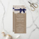 Das Design zeichnet sich durch einen hübschen rustikalen Burlap-Effekt-Hintergrund aus, der mit einem romantischen, Vintagen, weißen Spitzen-Effekt-Trim mit einem atemberaubenden Marineband mit Bogen fertig gestellt wurde. Diese Programme können für Ihren besondere Anlass personalisiert sein und würden die perfekte Vorlage für Hochzeiten, Brautpartys, Verlobungsfeiern, Geburtstagsfeiern und vieles mehr machen. *Bitte beachten Sie, dass Zazzle nur Printprodukte verkauft, sodass diese Programme keine echten Beinschleifen, Spitzen, Bogen oder Bänder haben.