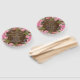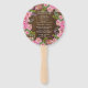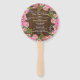 Rustikales Holz aussehender Hochzeitsprogramm-Fan, mit Grafiken eines rosa Peony Blumenkranz rund um den Rand. Personalisieren Sie den Text auf beiden Seiten des Ventilators für Ihren Hochzeitstag.