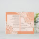 Elegante weiße Spitze mit Perlen korallenorange Hochzeitszeremonie und gefaltetes Party mit weißer Spitze mit beige/ekru Perlen auf Korallenorange, die zwei Ecken eines weißen Rechtecks mit korallorange Rand bedeckt. Text in braun. Beachten Sie, dass die Spitze "bedruckt" ist und nicht echtes Gewebe. Dieses elegante und romantische Design ist Teil eines Hochzeitsgeschehens und eignet sich hervorragend für eine stilvolle Frühjahrs-, Sommer- oder Herbst-Hochzeit. Man muss sich in der Mitte falten, um ein gefaltetes Programm zu haben. Wählen Sie nur den Papierwerttyp aus, der sich gut faltet.