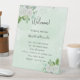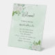 Der grüne Hintergrund ist mit weißen Blumen, Eukalyptusgrün und Imitaten mit silberfarbenem Glitzer verziert. Personalisieren und fügen Sie Ihre Namen und Ihre Hochzeitstag Zeitleiste.