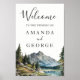 Hochzeitswillkommensschild mit wunderschöner Gebirgslandschaft. Dieses Schild ist ideal für Ihre Hochzeit am See, Feier am See, Feier im Freien.