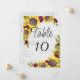 Sonnenblumen auf weißem Holz: Vorlage für die Hochzeit der Tischnummer. Dieser Herbst ist einfach, aber elegant und eignet sich perfekt für eine stilvolle Hochzeit. Das neutrale Design besticht durch eine minimalistische Karte, die mit einem romantischen Sonnenblumenspray mit weißem Holzboden dekoriert ist.
