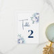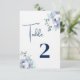 Diese Hochzeitstischkarte wird in weißem Leinenkartenpapier mit modernem Layout eines Aquarellkunstdrucks mit schönen blauen und weißen Blume gezeigt. Text in einer Navy Blue Farbe. Passen Sie dieses Element an, indem Sie den Beispieltext nehmen und stattdessen Ihre Informationen darin einfügen. Bestandsbild: freepik.com