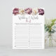 Ein lustiges Spiel für ein Brautparty, "Wedding Words A-Z" ist ein Spielblatt für Ihre Gäste, um so viele Hochzeitbegriffe aufzuschreiben, wie sie sich vorstellen können mit jedem Buchstaben des Alphabets. Die Person mit den meisten Worten gewinnt! Diese Spielkarte hat schöne rustikale Blumengestecke in Bordeaux, Pflaume, staubiges Rosa und Elfenbein. Es ist Teil einer Brautparty-Sammlung von passenden Gegenständen, um ein schönes Brautparty zu beherbergen.