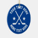 Sports de hockey sur glace sur mesure ornement d'arbre de Noël. Design sportif avec modèle de typographie athlétique, bâtons de hockey croisés, rondelle et étoiles. Ajoutez votre propre salutation, une citation amusante, le nom de famille, le nom de l'équipe, etc. idée cadeau cool pour amis, famille, joueur, maman, papa, coach, enfants, garçon, fille, formateur, collègue etc. Décor x-mas à thème. Inclut une chaîne en or brillant. Joyeuses fêtes ! Couleur bleue ou personnalisée.