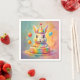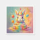 Ein spielerischer kleiner Hasen sitzt stolz mit einem lebendigen Geburtstagskuchen. Der Hase ist umgeben von sanften Pastelltönen, skurrilen Dekorationen und Ballons und schafft eine fröhliche und feierliche Atmosphäre, die perfekt für einen besonderen Tag ist.
