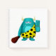 Kleines aquamarines Monster aus Cartoon mit Hörnern und blauen Augen, mit einem gelben und schwarzen Leintuch, mit einem Holzklub in der einen Hand und mit der anderen winkend.