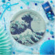 Dies ist ein zeichn von blauen, cyan-und aquamarinischen extremen Meereswellen mit Schaum und Spray, basierend auf der Arbeit von Katsushiki Hokusai (1760-1849).