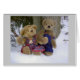 Wie romantisch! Ein junges Teddypaar mit Pfoten, während sie an einem Winternachmittag unter einem Baum sitzen.