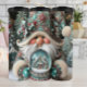 Diese detaillierte Weihnachtsabbild zeigt ein festliches Gnomen mit einem langen, weißen Bart und einem aufwändigen Hut, der mit einem großen aquamarinen Band und Heiligen geschmückt ist. Die Gnome enthält eine Schneekugel mit einer gemütlichen Hütte, Set vor einem Hintergrund schneebedeckter Weihnachtsbäume und schimmernder Dekorationen. Das skurrile Design vereint eine warme, magische Urlaubsszene.