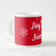 Diese Jumbo-Kaffee-Tasse wird mit einer niedlichen Urlaubsbotschaft von Jingle Juice print mit Schneeflocken gezeigt. Passen Sie dieses Objekt an oder kaufen Sie, wie es ist. Bild
