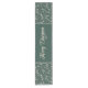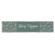 Dieser schlichte Weihnachtstisch-Läufer zeichnet sich durch ein wintergrünes Urlaubsmuster aus, das in sanften Tans und Tees auf einem dunklen, aquamarinen grünen Hintergrund erscheint. Die Mitte des Läufers zeigt den Gruß "Frohe Weihnachten", der in elegantem Drehbuch erscheint.