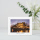 Carte postale des maisons de canal d'Amsterdam de style traditionnel à côté d'un pont sur les canaux Prinsengracht et Brouwersgracht illuminé à la tombée de la nuit pendant l'Heure Bleue en Hollande avec une bordure blanche et le texte : 'Holland'.