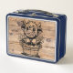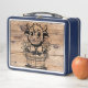 Höhere Kuh sitzend in Eimer auf Imitaten Holzkorn Rücken gemahlen auf Blue Metal Lunchbox.
