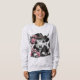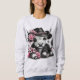 Eine niedliche schwarz-weiße Highland Kuh mit einem schwarzen Hut, der mit rosa Blume geschmückt ist und Charme und künstlerisches Design beweist.
