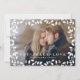 Des cadres de cartes de voeux de vacances simples et élégants encadrent votre photo horizontale avec une bordure de feuilles et de baies de houx blanches. Personnalisez avec un message de Noël ou de vacances (illustré avec "joie, paix, amour") et vos noms en dessous. Ajoutez une photo supplémentaire au verso sur un fond rouge canneberge festif avec une bande de feuillage de houx assorti.