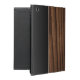 Schönes iPad Folio Gehäuse, mit Grafik eines braunen Holzkornaussehens, das in der Mitte des Gehäuses läuft. Ein schwarzes metallisches Aussehen, sowohl an den vorderen als auch an den hinteren Kanten, hat ein silbernes Tonband als Rahmen. Personalisieren Sie das Monogramm mit einem Buchstaben auf der Vorderseite, um Ihre Bedürfnisse zu Anzug. Gute Geschenkidee