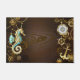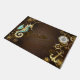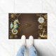 Brauner Holzboden mit Meer, mechanischer Rücken, antikes Lenkrad, goldener Anker und verschiedene Gold- und Messinggetrieben. Steampunkstil.