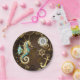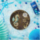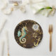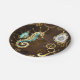 Brauner Holzboden mit Meer, mechanischer Rücken, antikes Lenkrad, goldener Anker und verschiedene Gold- und Messinggetrieben. Steampunkstil.