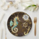 Brauner Holzboden mit Meer, mechanischer Rücken, antikes Lenkrad, goldener Anker und verschiedene Gold- und Messinggetrieben. Steampunkstil.