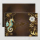 Brauner Holzboden mit Meer, mechanischer Rücken, antikes Lenkrad, goldener Anker und verschiedene Gold- und Messinggetrieben. Steampunkstil.