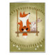 Ein Fuchs und ein Hase sitzen auf einem Baumschwung mit niedlichem Grinsen auf den Gesichtern in diesem Waldbild. Die Weinberge kreisen über und unter ihnen als dunkle Avocado-grüne Farbrahmen und leuchten in der Mitte auf. Weiße Wirbel und Kronleuchter sind in den Ecken zu sehen. Originelles Design von Christie Black von Kreationen aus dem Herzen.