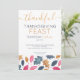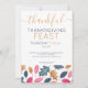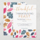 Woodland Leaf Pattern Erntedank Dinner Party Einladung aus Ricaso Dieses köstliche Urlaubsmessen lädt mit einem zarten Schriftart in goldener Farbe ein - mit dem Wort "dankbar" - und einem blauen, rosa, grünen und goldgelben Blattmuster vorne und hinten