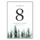 Die weinfarbenen Waldkarten mit ihrer schicken Tischnummer bieten eine Gruppe von Aquarellkiefern in Jägergrün und Salbei Grün. Personalisieren Sie mit jeder Tischnummer, mit Ihren Namen und Hochzeitsdatum unten. Design wiederholt sich auf der Rückseite. Koordiniert mit unserer Hochzeitssuite Timber Grove.