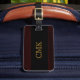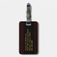 Gepäckanhänger mit Holzkorn sehen Foto Hintergrund mit Monogramm auf der einen Seite und Namen und Kontaktinformationen auf der anderen Seite aus.