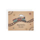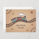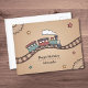 Eine Geburtstagskarte mit einer Illustration eines lächelnden hölzernen Zuges, der auf einer kurvenreichen Strecke herumläuft. Der Kartenhintergrund ist ein warmes, gestuftes Beige mit subtilen Details wie Holzgestänge und von Hand gezeichnet Sternen. Ein schönes Bild, das Sie zum Geburtstag eines Kindes oder zum Geburtstag eines Holzspielzeugliebhabers schicken können.