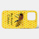 Honigbienen-Handy-Gehäuse in einem gelben und orangefarbenen Honigkamm-Muster. Die Grafik einer großen Honigbiene schmückt die Mitte. Personalisieren Sie den gesamten Text, um Ihre Bedürfnisse zu Anzug.