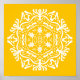 Dieses weiße Mandala sitzt auf einem honiggelben Hintergrund. Die Farben sind warm und friedlich. Teil der Erghenn Mandala Kollektion.