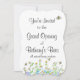 Une invitation à la fête amusante et joyeuse avec des abeilles au miel visitant un jardin de fleurs de camomille dessiné en stylo noir et encre à l'aquarelle. Customisez l'invitation avec vos informations avec la police et la couleur de police de votre choix.