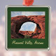 Der Honeymoon Arch ist eines der interessantesten Bauwerke im Monument Valley, einem faszinierenden Navajo Park in der Nähe der vier Ecken von Arizona, Utah, Colorado und New Mexico. Monument Valley und Mystery Valley sind phantastische Träume von Bögen, Petroglyphen, Hogans, Mesas, Anasazi Ruinen, und verschiedenen surrealen rötlichen Sandsteinstrukturen. Dieses Weihnachtsschmuck zeigt ein schönes Bild des Honeymoon Arch vor einem grünen Hintergrund mit dem Text "Monument Valley".