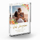 Dieser kundenspezifische Flitterwochen-Fotoblock kennzeichnet einen Hand beschrifteten Imitatgoldskript-Schriftart, Ihr persönliches Foto, das durch tropische Watercolor-Blumen umgeben werden und einen Goldrahmen mit Ihrem Namen- und Flitterwochendatum.