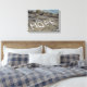 Ein kreatives Design mit dem Wort "Hoffnung" aus weißen Muscheln am Strand gemacht. Das Meer und die Felsen im Hintergrund.