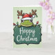 This delightful digital drawing showcases a happy holiday frog 🎅🏼🎄🎁. The frog is a bright green color and wears a Santa hat with reindeer antlers. It has big, expressive black eyes that give off a sense of fun and joy. The frog is adorned with red and green Christmas lights wrapped around its hat and antlers, adding a festive touch. The background is a soft green color that fits well with the main colors of the frog.