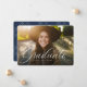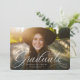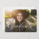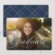 Ein klassischer und eleganter Script-Absolvent in Weiß sitzt am unteren Ende eines horizontalen Fotos. Der benutzerdefinierte Text enthält Platz für den Namen des Absolventen und auch die Schule und das Jahr Details. Der klassische marineblau-Backer hat ein einfaches Rastermuster, und die Farbe kann durch Klicken auf "Weiter anpassen" geändert werden. Mit diesem Design verkünden Sie die Leistung Ihres Absolventen an Freunde und Familie!